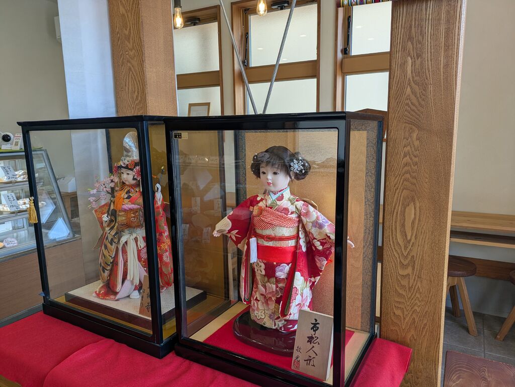 お雛様めぐりをしてきました。和菓子屋さんにはガラスケースに入ったかわいいお人形がかざられていました。ショーケースには和菓子やこしあん入りイチゴのショートケーキが。 (訪問:2026/03/07)