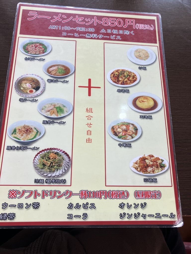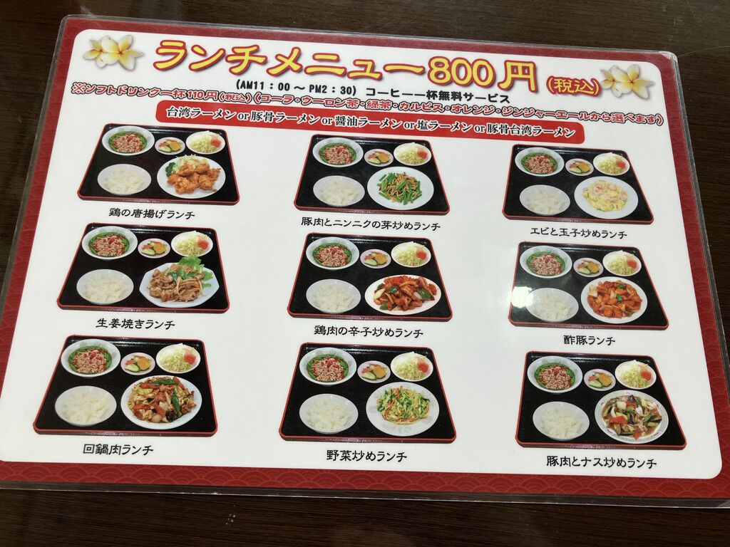 前から気になってたお店で初めて来ました。ランチセット800円で9種類あってどれにしようかと迷って回鍋肉ランチで麺は台湾ラーメンにしました。ボリュームあってこの価格で満足のお昼ご飯でした。食後にコーヒーも付いて美味しかったです。ご馳走様でした。 (訪問:2025/11/18)