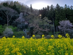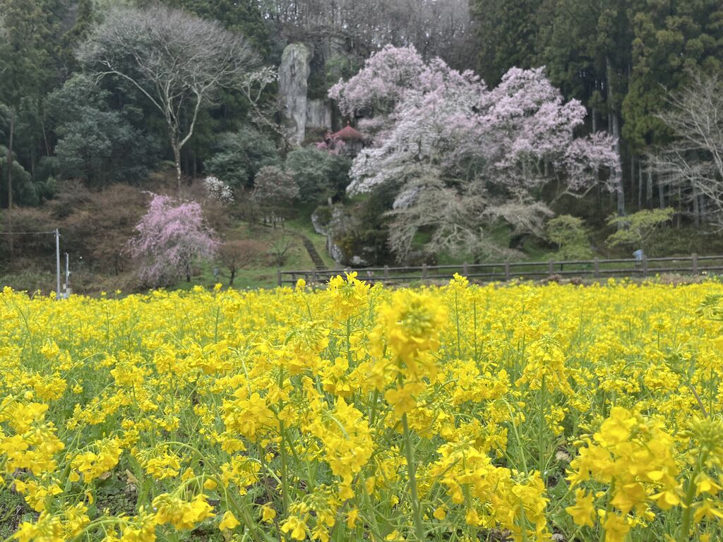 桜が満開。見頃です。下の菜の花と観音堂の桜。鮮やかなコントラストが綺麗です。夜のライトアップも神秘的な美しさですが、朝日を浴びた景色も鮮やかですね^_^ (訪問:2025/04/17)