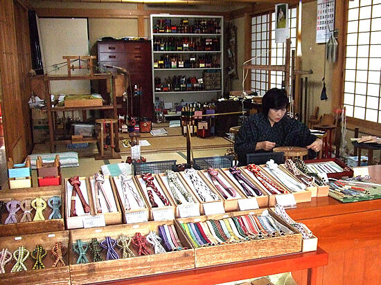ゴールデンウィークに初訪問。店内では組ひもの制作体験をされている女性グループを見受けました。伝統工芸品である組ひもは、帯締めなど和服の装身具として使われますが、手頃な値段のキーホルダーとストラップが販売されていたので、これらを購入し、家族へのお土産としました。非常に好評で、どちらも愛用してもらっています。パンフレット(写真左側)には、“紐を結ぶ・縁を結ぶ・心を結ぶ”と書かれています。“ぐッ”とくる言葉です。 (訪問:2023/05/04)