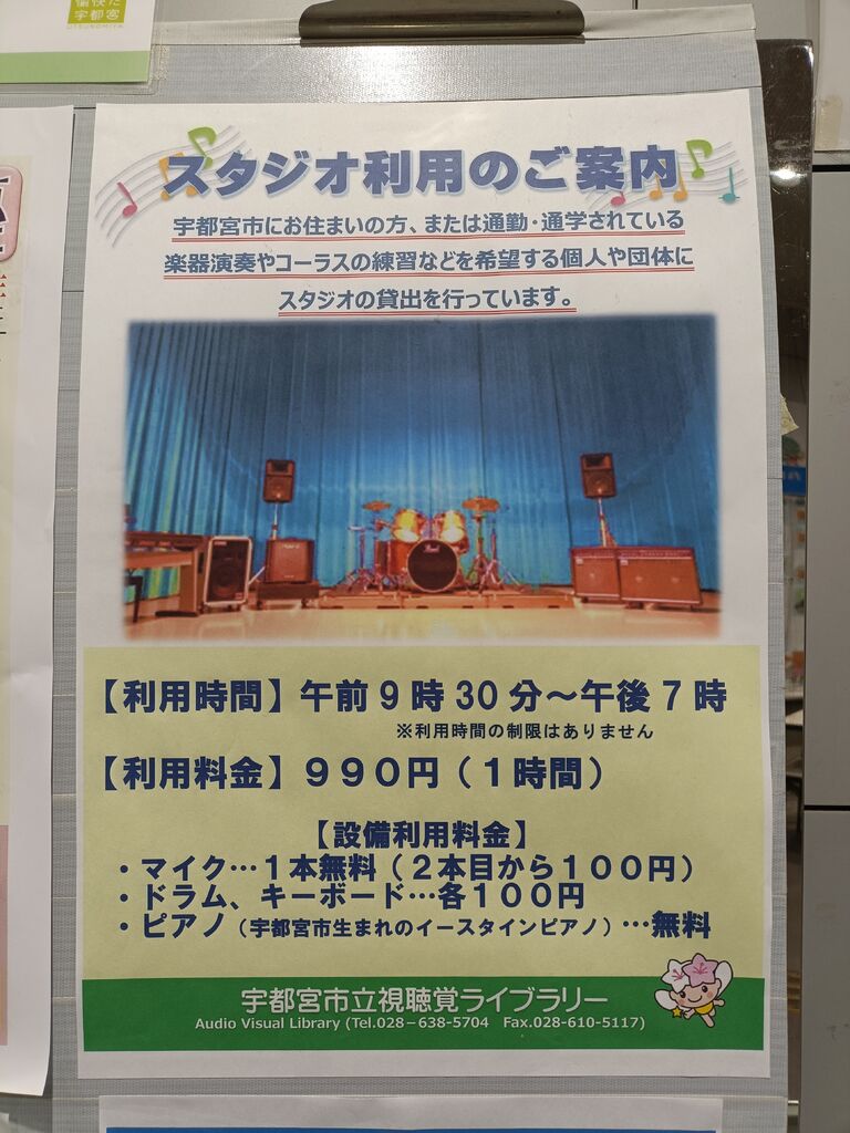 視聴覚ライブラリーでは、音楽スタジオが安く利用できます。複数人で使用する場合は他のスタジオに比べてお得です。追加料金はかかりますが、録音もできるのは嬉しいです♪結構良い機材が揃っています。 (訪問:2026/03/10)