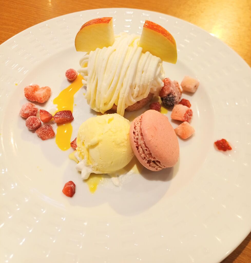 ココスの期間限定スイーツ「お月見のフロマージュモンブラン」を食べました。クーポンを使って200円引きになり429 円でした。モンブランにりんごを突き刺してうさぎの耳に見立てた可愛いデザートで、マカロンとバニラアイスもついていて豪華でした。 (訪問:2025/09/07)