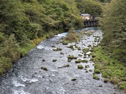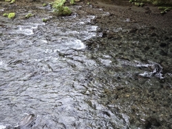 神橋近くの大谷川です。エメラルドグリーンにそまる正に川底まで透き通った、天然の大自然そのものの河川ですね。その清流の美しい流れにしばし圧倒され、感動いたしました。 (訪問:2025/10/19)