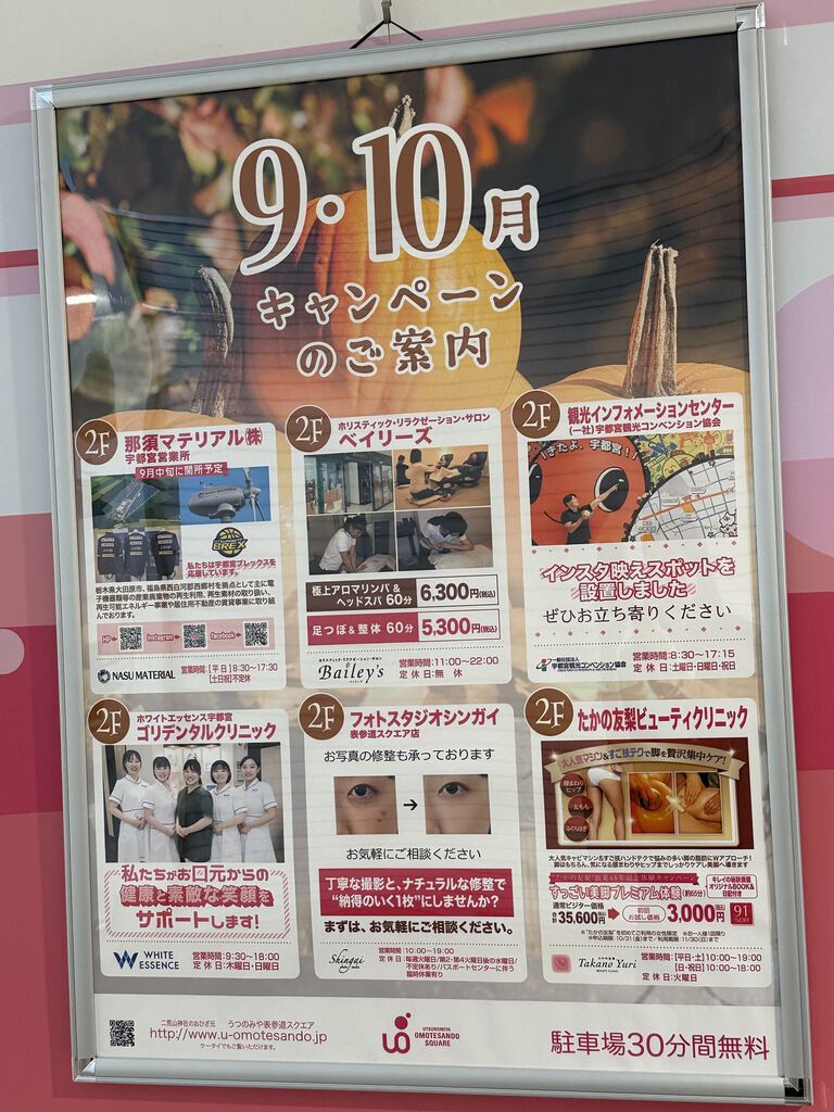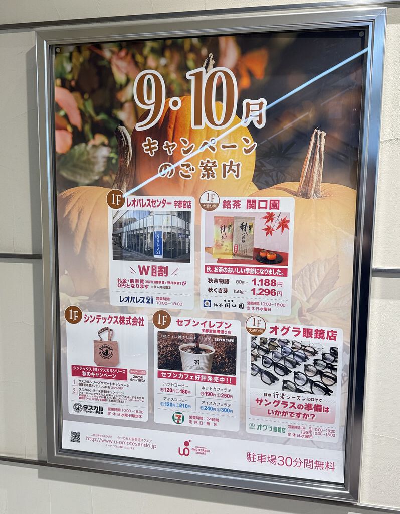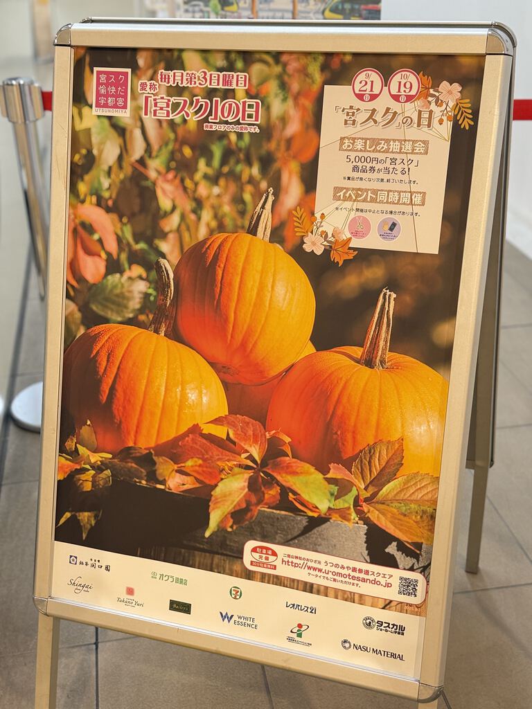 うつのみや表参道スクエアさんのフォトスポットは、引き続き9月27日の「黄ぶなの日」にちなんだスポットで秋らしい光景になっていました(*^_^*)2階の宇都宮観光コンベンション協会では、宇都宮ジャパンカップサイクルロードレースのクリテリウムの特別観覧席の案内もありました♪ガラス張りなので大通りを見下ろせるのは素敵ですね♪ (訪問:2025/09/29)