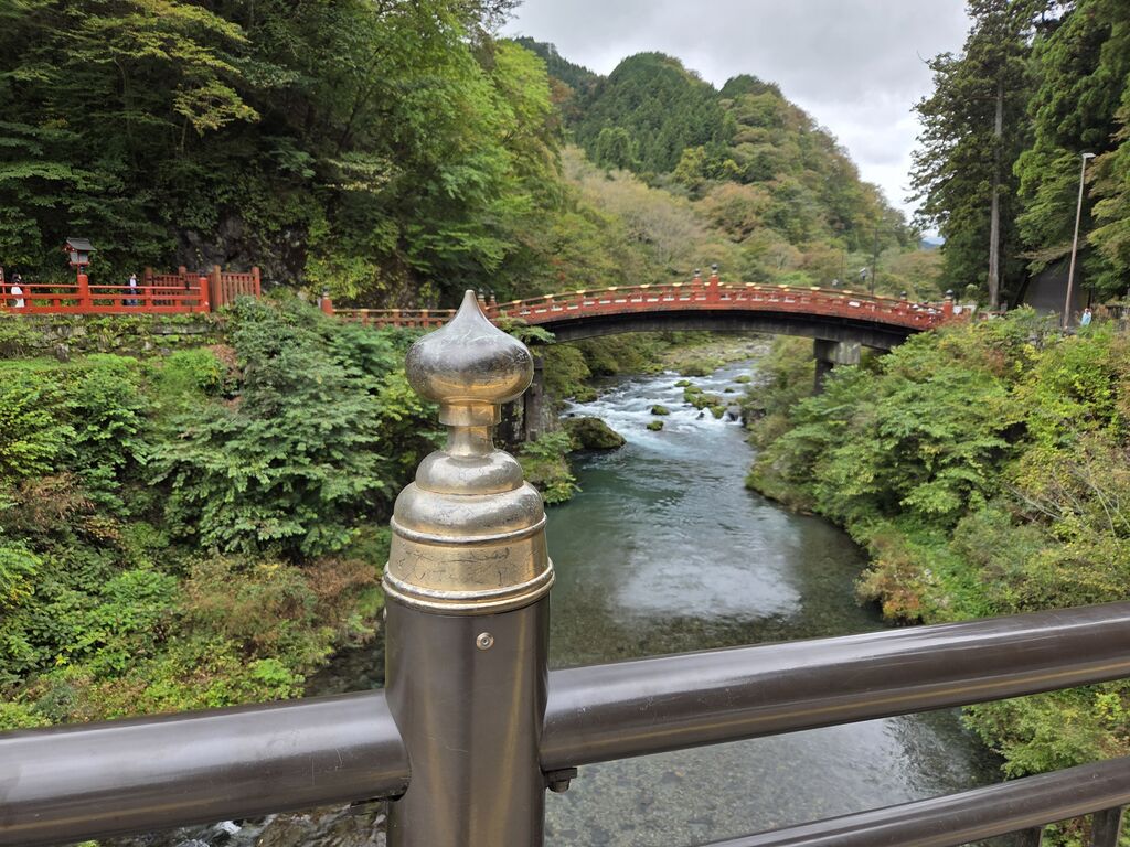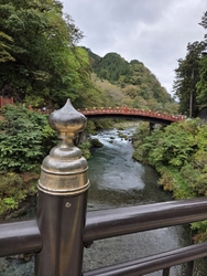 金色に輝くこの日光橋の欄干の擬宝珠(ぎぼうしゅ)は、正にここ、神橋の隣に掛かる日光橋にしかないのではないでしょうか。外国からの沢山の観光客を招待するにも、この様な美しい擬宝珠を、持つ橋は、正に日光橋ならではの装飾ですね。この橋の上から隣の神橋を撮影する外国人観光客が多くなりましたね。 (訪問:2025/10/19)