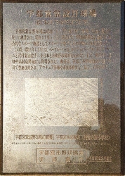 宮の原小学校敷地内の校門そばにある碑で、敷地6,150坪(約20,330㎡)、収容人数20,000人の当時としては全国屈指の球場であったことなどが記されています。なお、ご見学の際は事前にご連絡くださいますよう、お願いいたします。