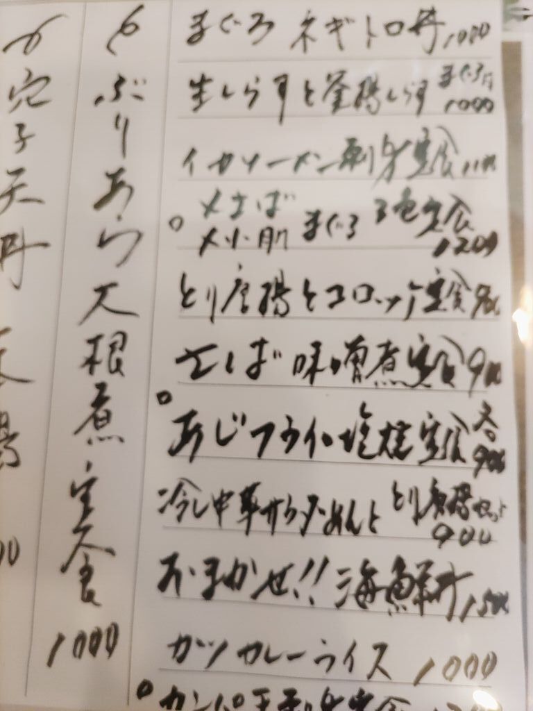あじフライ定食税込み900円をいただきました。税込み900円でこのボリュームはすごいです。まず、お味噌汁。手作り感が素晴らしいです。油揚げの入ったお味噌汁は何回も作ったり、お店でいただいたことはありますが、この正方形のカットの仕方は素敵です。お新香も食べ応えあるカット。奥まで味が染みているので、ほんとおいしいです。歯ごたえもとってもいい感じです。ひじきの煮物もまじおいしい。ご飯の上に乗った黒ごまもおしゃれ。このひと振りで、お膳の風格みたいなものが、ぐっと上がります。そして、メインのあじフライがほんとに激旨です。あじの身もふっくらですが、衣もふっくら。さくっとしてとっても軽い口当たり。ソースとタルタルソースの両方が付いてくるので、ソース味、タルタル味、両方を一度に付けてミックス味にしたりと、色々楽しめました。手書きのメニューも素敵ですが、テーブルに消毒液が2種類も置いてあったりと、心遣いもありがたいです。カウンターで静かに頂くあじフライはほんとにおいしかったです。 (訪問:2021/09/06)