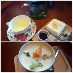 ハーブティーを頂けるカフェが出来たと聞き早速訪問です。ご自宅を改装されたログハウスの店内は木の温もりで落ち着きます。靴を脱いでお店に入ると、大きなテーブルやカウンター、雄大な景色を堪能出来る窓際の特等席など様々。元気いっぱいのお母さんの手作りランチや、ご自宅で栽培されているハーブを使ったオリジナルブレンドのフレッシュハーブティー等あり、『フレッシュハーブティー450円』『レアチーズケーキ250円』をチョイス。ミントがベースのハーブティー、乾燥させたものよりも香りが強く清涼感も抜群。飲み初めはキツめかな??なんて思っていても気付けば清涼感が心地いい☆大きいポットでの提供も嬉しい^^レアチーズケーキには娘さん手作りのブラックベリージャムがプラス。軽めの食感でランチ後のデザートにピッタリ。酸味は控えめ、そのままでもジャムを付けても美味しいです♪サービスでシチューを頂きましたが、お野菜がゴロゴロ入った美味しいシチューでした。おもちゃ等もあったのでお子さん連れでも楽しめますね。国道461号から入ること600m程の場所で道が大きく右にカーブしますが、そちらには進まず左斜め前の脇道に入ると迷わず到着出来ますよ。 (訪問:2015/09)