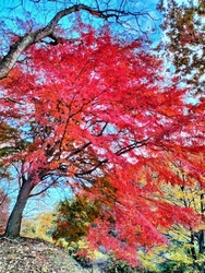 川崎城跡(矢板市文化財)の駐車場ではイチョウがエンジン全開に黄葉しておりました。その上の南曲輪付近の山際ではモミジが勢力範囲を広げ紅葉フル回転です。全体の20%の青色モミジ、30%の黄色モミジ、50%の赤色モミジが自然のグラデーションを作り上げておりました。 (訪問:2023/11/25)