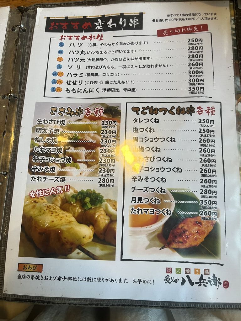 お気に入りのお店です。本店の方によく行きますが、八兵衛さんは、一番美味しい焼き鳥屋さんだと思っています(*^^*)オススメはレバー。レバーってこんなに美味しかったか?と感動します。是非食べてみてください。 (訪問:2019/08/31)