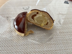 こちらは危険な洋菓子。食べ過ぎる。何故って、軽くてふわりふわりしていて、中のクリームチーズの甘味や酸味が絶妙に美味しくて重ったるくなく非常に非常においしー。夕食後に食べたのにも関わらず、危うく3個食べそうに...2個で止めておきましたが、頑張ればもう1個いけそうな気が(笑)食欲の秋だからなのか???プラス、このお菓子自体が凄く美味しいんです。絶対‼! (訪問:2025/10/21)