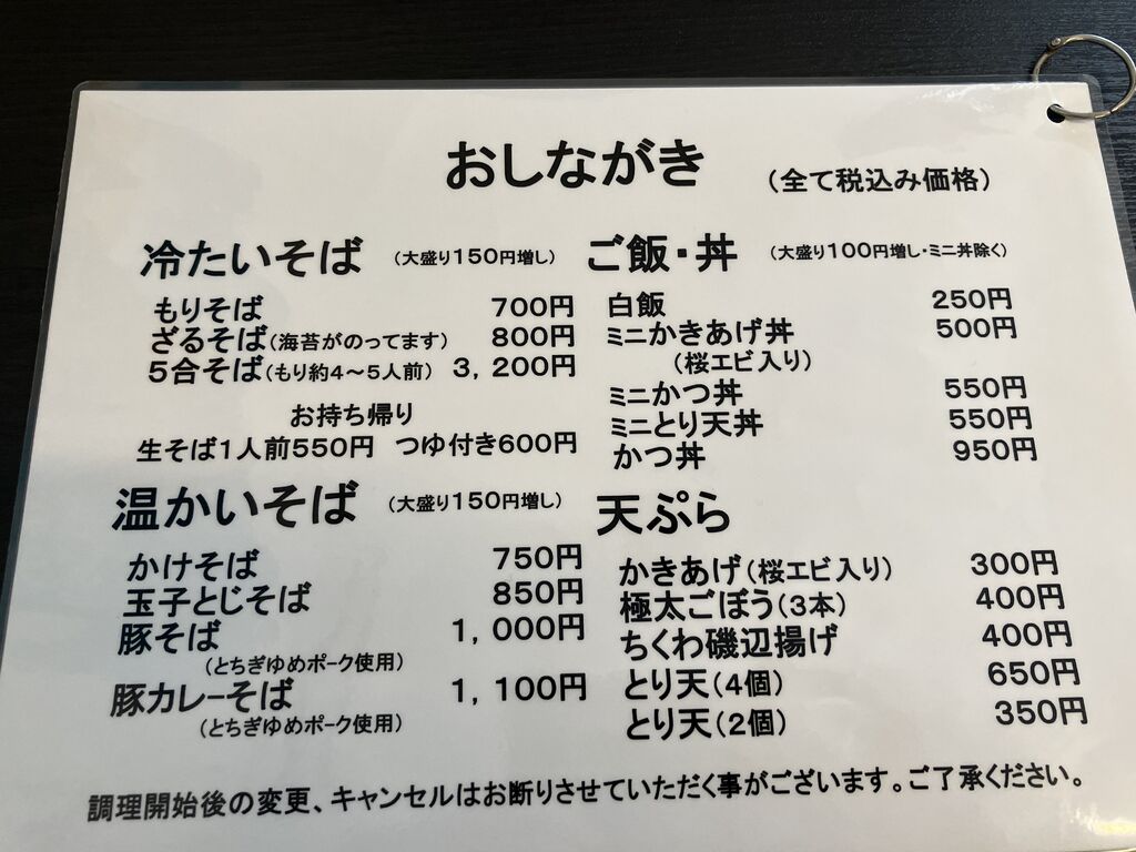下野市に住む友人に教えてもらい、宇都宮から約50分で到着。友人から早めに行った方が良いと言われ、11:20頃着。先客二組。もりそば、かき揚げ、とり天をオーダー。10分程でかき揚げととり天が到着。二つとも大きさにびっくり。かき揚げは桜エビ入りで添えてある塩でひとくち。カリッとしていて、タマネギの甘さが塩でひきたち旨い!とり天には刻みわさびが添えてあり、これも旨い!とり天を刻みわさびで初めて食べました。はまります。もりそばが到着。まず見た目で旨そうです。黒い星が入った細切りそば。そのままひとくち。香り、甘みが強くコシもあり旨い!つゆは鰹が強くそばとの相性抜群です。栃木県内のそば屋を60店舗以上食べ歩きしてきましたが、かなりの腕前だと。食べ終わる頃には満席で4人ほど並んでました。お見事、ご馳走さまでした。 (訪問:2023/10/13)