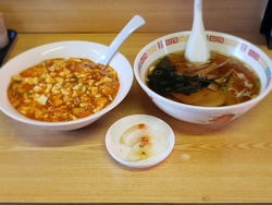 ランチ 麻婆丼600円献血帰りのお昼は、ランチ麻婆丼をいただきました(^○^)熱々の麻婆豆腐に、半ラーメンまで付いてコスパ最高です。d=(^o^)=bラーメンも昔ながらの中華そば、メンマが沢山で、わかめもチャーシューも分厚いナルトもうまかっぺよ☆( ^-^)ノ∠※。.:*:・'°☆ (訪問:2024/12/11)