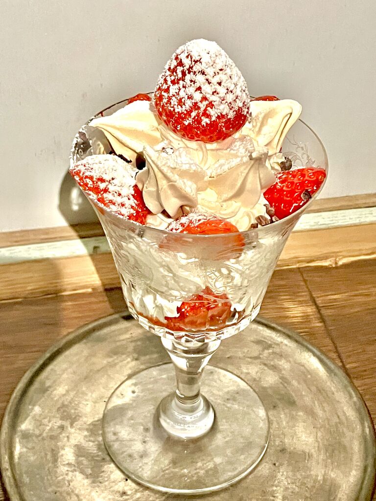 今日で初来店からちょうど4年が経ちました。あの時は、オープン時間に一番乗りで、しかも最初からカウンター席へ何も考えず座った記憶があります。今だったら出来ないなぁ〜( ˘ω˘ )さて今回は、以前《雨さん》の2020年の口コミの1コマに出てきた【琥珀の女王】を!それとインスタを見て即座に予約した【苺とチョコレートアイスのヴァシュラン】をオーダー!琥珀の女王ですよー♪素敵なネーミングですよね!運ばれて来てビックリ‼︎カクテル⁉︎HOTかと思っていたらアイスでした!女王ですが、想像していたよりとっても甘くクリーミー。アルコール入れたらカクテルとしても出せそう❣️本当に驚きの連続でした✨ヴァシュランのトップは、生クリームと思いきやサクサクの焼きメレンゲ&所々にイン!真ん中にチョコレートアイスがあり、これがとっても上品な美味さなのです(^^)全てが美味しい⤴︎⤴︎本当に美味しい時ってこのフレーズしか出て来ないんです(^^)今日は、なかなか出なそうな?ヴァシュランに出会えてラッキーでした✨これからも飲み物&ケーキ類の新作など期待しております(o˘◡︎˘o)♪︎ (訪問:2026/02/14)