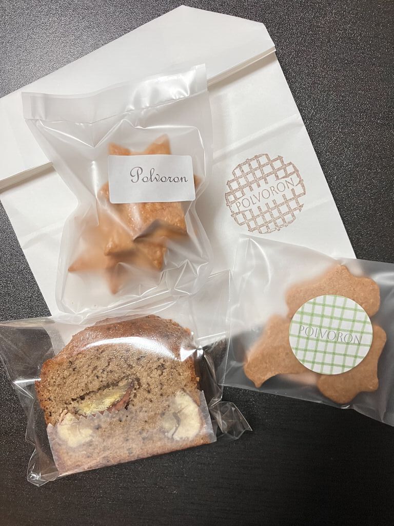 用事があってお休みした金曜日の午後、ちょっと時間ができたので、ポルボロンさんに寄ることができました〜。今回は「コーヒーと栗のパウンドケーキ」「星のクッキー」「ペンギンクッキー」の3種を購入。「急に涼しくなりましたね〜」と、店主さんとの会話にもほんわかさせていただきました。早速夕ごはん後のおやつに、パウンドケーキをいただきました。ほっこりとした食感の生地に、コーヒーの粒々食感が良いアクセントに。栗の優しい甘さがたまらなく美味しくて、おかわりしたいくらいでした。ポルボロンさんのお菓子は、いついただいても手作りの優しい美味しさに癒されます。残りのクッキーも大切にいただこうと思います。美味しい幸せをありがとうございました。ごちそうさまでした〜。 (訪問:2025/09/12)