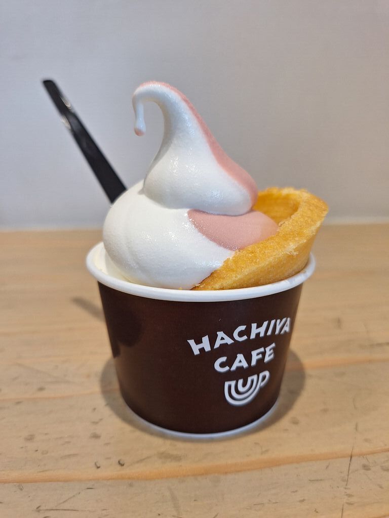 ハチヤカフェで一休み(*´▽`)私は賞味期限10分のバウムクーヘン、旦那はバウムソフトを購入しました。賞味期限10分のバウムクーヘンはふわぁっとして暖かく美味しいです!4種類の味のバウムクーヘンが食べられるので、美味しいと思ったバウムクーヘンをお隣のショップで買って帰ることができます( ´∀`)私はプレーンのバウムクーヘンが卵の風味がして優しく美味しかったので実家へのプレゼントに買って行きました。バウムソフトもソフトクリームがメインかと思いきや、バウムクーヘンが横にも下にも敷き詰められていてお得感がありました♪ (訪問:2025/07/27)