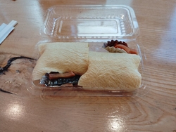 今日は、 日光市 ふだらく本舗 石屋町店さんに来ました。お目当ては、湯波むすびです。湯波なおにぎりです。1パック、2個入りで、600円(税込み)です。今回は、3パックを購入して、2パックは、テイクアウトして、1パックは、店内で、食べました。スタッフさんによると、次から次へと作っても、すぐに売り切れちゃうと言ってました。なので、今、できた、出来立てですと言ってました。ほんのり、あたたかい湯波むすびです。お上品な味つけな湯波に包まれた、甘みのあるおこわ(もち米)で、絶品にうまい。嬉しいことに、漬物が、2個も入っています。すごい気配りですね。ごちそうでした。 (訪問:2025/12/30)