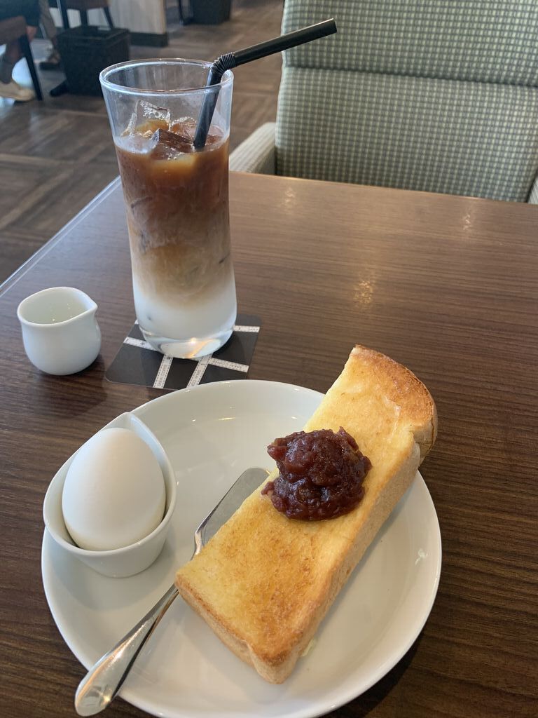 NEWモーニングでアイスカフェラテにモーニングサービスの小倉トーストをいただきました。優しい甘みのあんでコーヒーに合いました。 (訪問:2025/09/28)