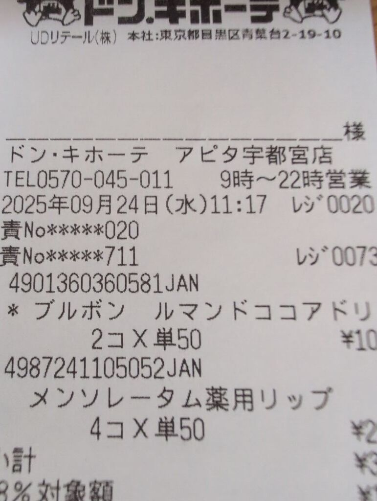 こちらの商品どれも1つ50円でした。メンソレータム薬用リップは9月限定で50円(普段は69円みたいです)ルマンドココアは在庫限りでした。飲んだことないので楽しみにしています。 (訪問:2025/09/24)