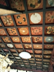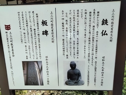本堂内に文化財が納められております。本堂に上がると花の種ご自由にお持ちくださいと書かれていてヒマワリ、ヒャクニチソウ、ニチニチソウの種が置かれておりました。嬉しいサービスです。小坊主さんのおみくじも人気のようです。上三川町最大の178cmある板碑(上三川町文化財)が横たわっております。文字が深くハッキリと刻まれていて亡くなった方々も極楽へと導かれただろうと思いました。中央の仏壇の厨子には60年に一度開帳の秘仏である御本尊の薬師如来坐像(上三川町文化財)が納められております。鎌倉時代作の仏様で顔の部分は銅ですが頭から身体にかけての殆どは鉄でできております。鉄でできた仏像は全国で約100体しかないので稀な存在で有難い仏様であります。上を見上げると天井絵がありました。大体は花鳥風月ですがコチラでは曼荼羅が描かれていて新鮮に感じました。 (訪問:2023/07/17)