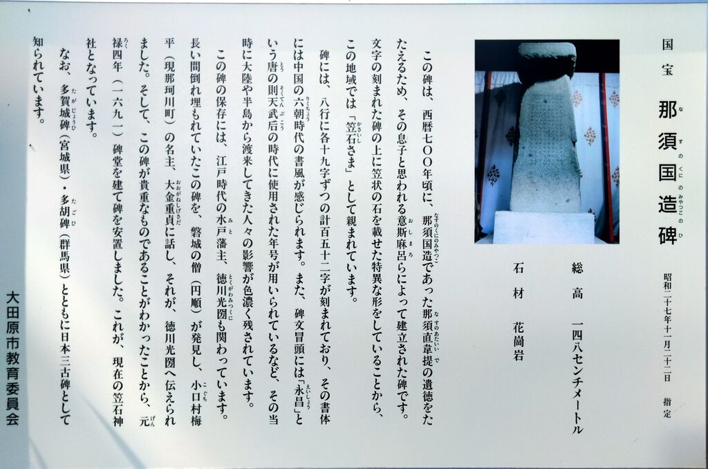 那須国造碑は、笠石神社の御神体です。この碑は700年に建てられ江戸時代に行われた日本初の発掘調査のきっかけにもなりました。碑文は152字で六朝風の書体で書かれており、宮城県の多賀城碑や群馬県の多胡碑と並び日本三古碑の一つに数えられています。