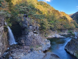 今日は、10月6日(月)の平日です。この滝は、駐車場から近いのですが、かなりの下り坂を下りると、見ることができます。下りる途中に神社があり、そこから見る滝と、坂を下り切ったところにある吊り橋から見る滝とありますが、どちらも見ていて迫力があります。吹く風は冷たいのですが、まだ紅葉は先のようです。 (訪問:2025/10/06)
