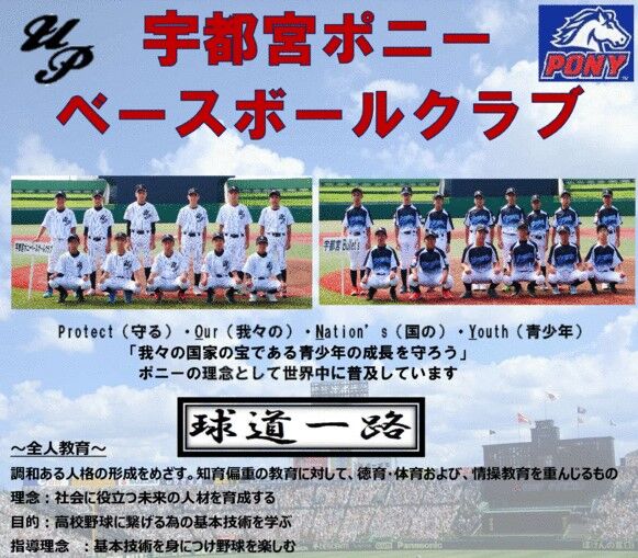 宇都宮ポニーベースボールクラブは第49回ポニーリーグ全日本選手権大会にて、べすと8に輝きましたとのこと。開催期間→ 2022年7月21日から7月26日。開催球場は東京都江戸川区球場他で、熱戦が繰り広げられました。宇都宮ポニーは3回戦まで勝ち抜き、ベスト4を目指して、大田スタジアムでの対戦に臨みましたが、敗戦。3年生の皆さん、お疲れさまでした。8月からは新チームが始動するとのこと。これからも宇都宮ポニーは、勝利を目指して、楽しく本気で野球に取組みますとの事でした。宇都宮ポニーでは、現在平日、火曜日、金曜日に夜間練習をしており、随時見学体験を募集中とのこと。土曜、日曜祝祭日は、逆川専用グラウンドにて練習、もしくは練習試合を行っているとのこと。グラウンド練習ももちろん、体験見学大歓迎ですが、試合で遠征している場合があるので、事前に問い合わせいただけると嬉しいとの事でした。雨天時は上桑島の室内練習場になりますとの事でした。 (訪問:2023/07/26)