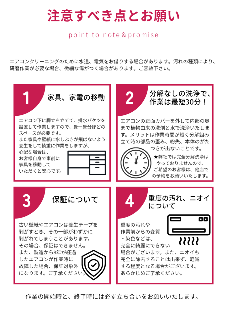 〇壁掛けエアコンクリーニング1台 8800円。 〇天井エアコンクリーニング1台 19800円。 〇室外機洗浄&ドレンホース点検 1100円。 〇キッチンレンジフードクリーニン1台 16500円。 |