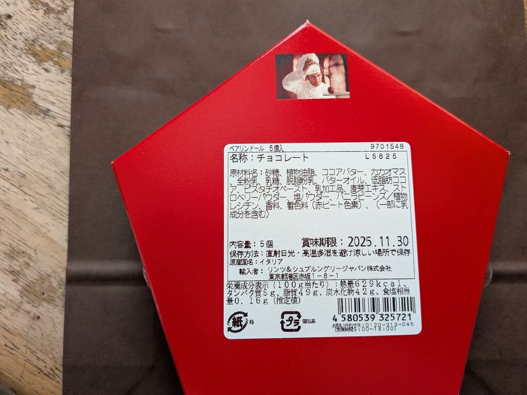 NEWリンツショコラブティック&カフェで、ペアリンドール5p461円・ミニプラリネヨーグルト90g1,164円をいただきました。もともとの販売価格がペアリンドールは1,180円、ミニプラリネは1,900円。アウトレット価格だけでもかなり値引きされているのに、アプリ会員になるとお得なクーポンもらえる上に、更に5%引き。とんでもない値引き率です。賞味期限が近いとは言ってもまだ余裕あります。だって、すごいおいしい。あっという間に食べきる自信あります。で、ひとくち。さすがリンツ。超濃厚だけど、決してしつこくない。癒されます。あと一つ、あと一つと思っているうちに、やっぱ、なくなりました。今日中に食べきるかも、と思っていたらほんとに食べちゃいました。レシートのアンケートで、100引きクーポンいただけるので、またお伺いします。 (訪問:2025/11/07)