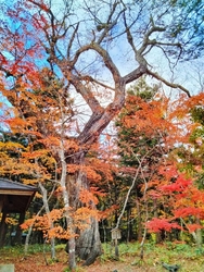 紅葉が全盛期を迎えておりました。私がいた時に立ち寄った人の全てが写真に収めております。クリの木である平清盛公(推定樹齢800年)と平重盛公(推定樹齢800年)にモミジが彩りを加え体をくねらせ喜んでいる様子でした。湯西川の温泉街で眺められる紅葉の名所です。 (訪問:2023/10/29)