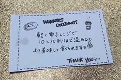 ずっと気になっていた『WORKERS DOUGHNUT』さんに行って来ました!可愛らしいお店で、笑顔でお店の方が迎えて下さいました!期間限定の【モカドーナツ】と【チョコレート】、それと【プレーン】【シナモン】を買ってみました!ふわふわでなめらかな生地のドーナツは、甘さ控えめでとても美味しかったです!こちらのお店はプレーンの卵なしも販売されているのでアレルギーの方にも安心して頂けます!お店の方もとても親切で、ドーナツの袋の中には素敵なメッセージカードも入っていて、ティーパックもプレゼントして頂きました!とても気配りの有る、心温まる素敵なお店です! (訪問:2022/01/27)