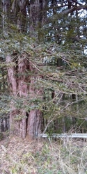 樹齢約400年(指定時)、樹高25m、幹回り6.38mの古木のイチイ(日光市天然記念物)は道路沿いギリギリに立っており地面より高い所にあるので樹高より高く見え圧倒的なスケールです。外見は幹や枝の広がりからスペインのサグラダ・ファミリアを彷彿とさせる樹木で威厳が感じられました。秋には葉の濃い緑色に赤い実が良く映えそうです。ましてコレダケの樹木ですから。その様子を見に再訪したいと思います。 (訪問:2021/12/16)