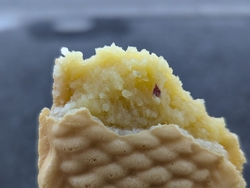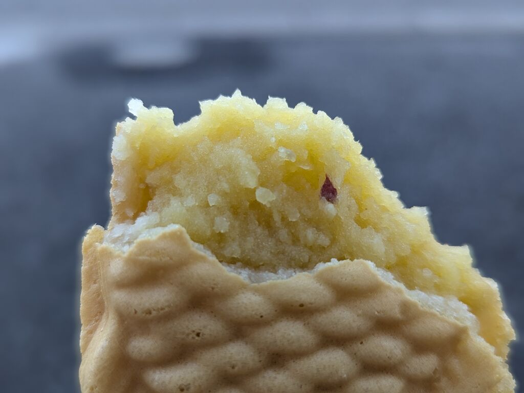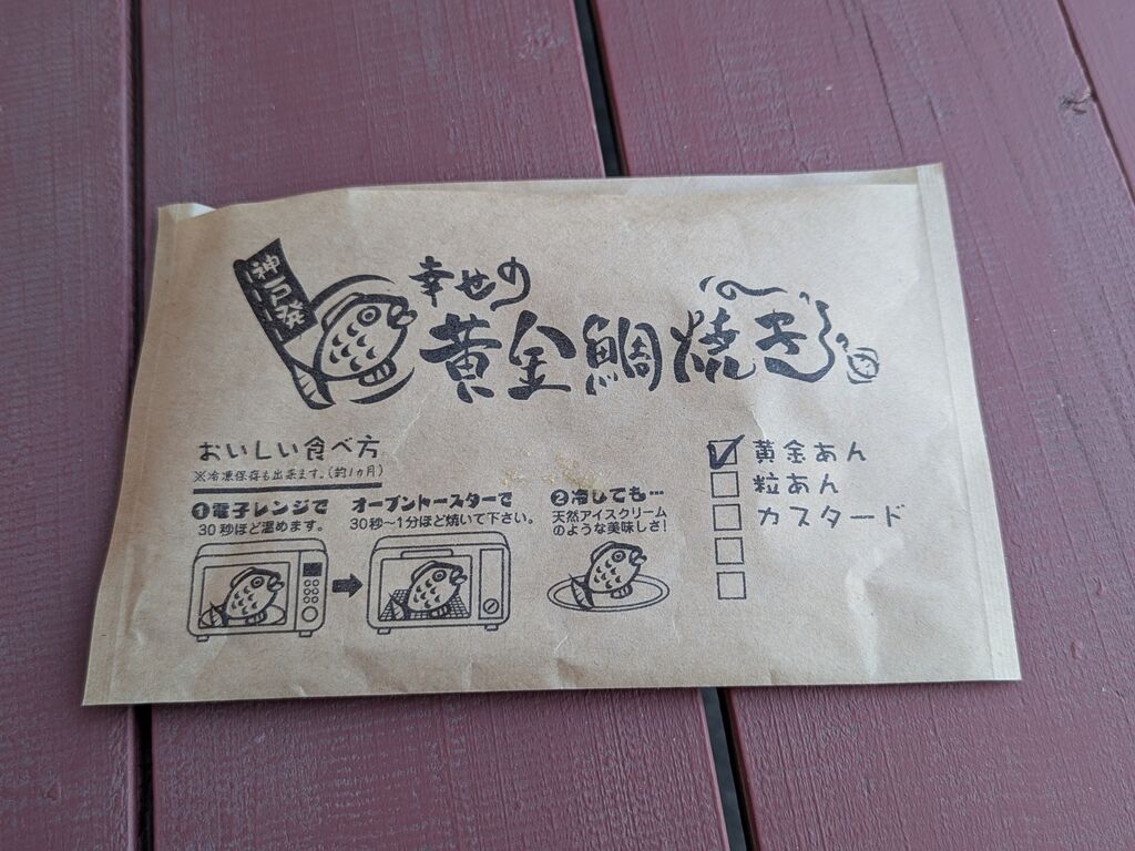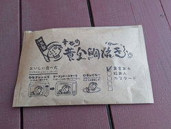 日曜日の午後に初訪問。「たいやき(つぶ餡)」を購入しました。焼きたてのため、本体のまわりには餃子と同じような“羽根”が付いていました。また、さつまいもの黄金餡も入っているので、なんだか二重に得した感じです。なお、紙袋には美味しい食べ方が記載されています。持ち帰りで冷めてしまったときでも安心です。 (訪問:2026/03/15)