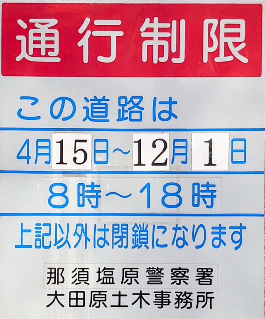 冬期通行止め規制(12月~4月中旬) (塩原側)那須塩原市塩原運動公園先ゲートから土平園地ゲートまで7.0km (板室側)那須塩原市深山園地休憩広場先ゲートから板室側ゲートまで7.9km |