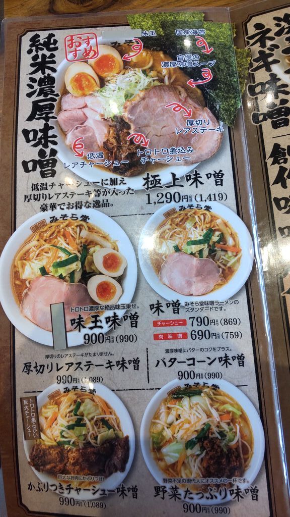 | 極上味噌 低温チャーシューに加え、厚切りレアステーキ等が入った豪華でお得な逸品。 |
