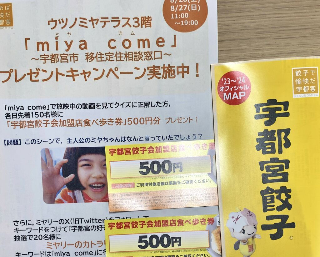 この日はLRT開業記念イベントで、miya comeで放映中の動画を見てクイズ正解すると、先着で宇都宮餃子会加盟店食べ歩き券をいただけました。宇都宮の案内動画の主人公ミヤちゃんは、おかっぱで元気の良いかわいい女の子です。 miya comeには、市内の高校や大学等のパンフレットもあるので、市内の学校に進学を考えている学生さんの参考にもなりそうですね。 (訪問:2023/08/26)