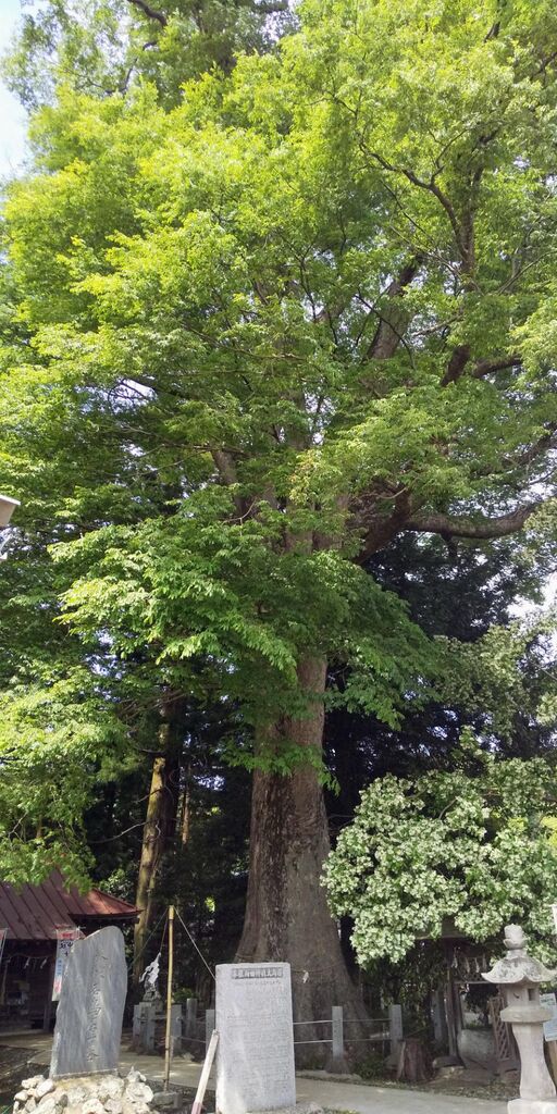 道の駅ばとうの裏手にある神社です。開運招福 神社十五社めぐりで訪れました。境内に入ると巨木のケヤキが聳え立っております。北向田のケヤキ(栃木県天然記念物 とちぎ名木百選)で樹高35m、推定樹齢600年の堂々とした御神木であります。根廻り15.47mもあるので囲いからはみ出し勢いが盛んでありました。本殿を窺うと前に狛犬が守備していて真丸なお目目で一点を凝視しておりました。海老虹梁、脇障子、扉脇に花、鳥などの彫刻が見られ腰組がドッシリとしている本殿です。拝殿には那珂川の石で造られた擬造魚が対でおります。那珂川の清流を泳いでいる鮎だと思いました。ケースに入っているスタンプ台とスタンプを拝借し台紙に押印しました。コチラの神社がトリで全十五社制覇しました。改めて無事何事もなく終了したことを神様に報告し神社を去りました。 (訪問:2022/05/15)
