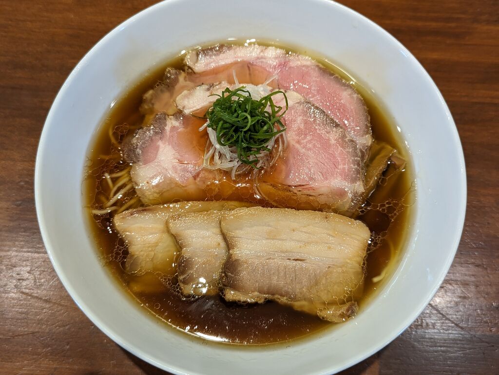 店内に入ると券売機がありました。醤油・煮干し・塩とあり、醤油と煮干しで迷いながら、押したボタンは【焼豚醤油そば】。とても香りがよく、しっかりとした味のスープです。細麺ですがコシがあり美味しかったです。上品なチャーシューが2種類トッピングされているので、ちょっと得した気分です。シンプルですが丁寧に作られていると感じられる美味しいラーメンでした。ごちそうさまでした。 (訪問:2023/10/17)