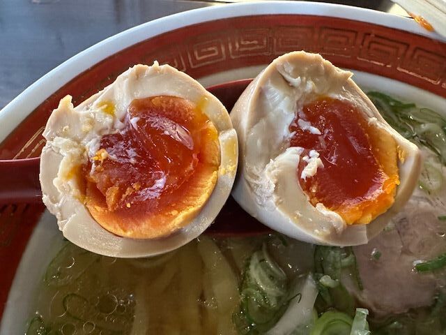 久々にお邪魔すると、券売機ではなく卓上からQRで注文、決済のシステムとなっていました。気兼ねなく注文できるのがいいですね。しかもPayPayが使えます。【煮卵ラーメン】にしました。もちもちの麺がやっぱり好きです。そして、チャーシューが2枚、太めメンマ、ネギの定番トッピング。そして、キミがオレンジに輝く煮卵、濃厚で外せません。美味しかったです。この日は全く混んでなかったので、ゆっくり味わえました。ご馳走様でした。 (訪問:2024/12/29)