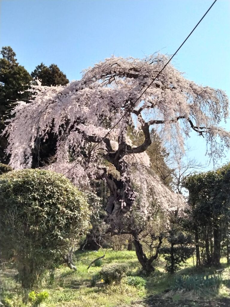 個人のお宅の屋敷内にあるので家の人に許可を得て近くで見させて頂きました。樹齢約230年、樹高11.5mのシダレザクラ(日光市天然記念物)は満開です。樹形が良く花々も沢山付き豪華なサクラであります。また捻りを加えた力強さを感じる幹から腕のように伸びる枝を含めた木全体がアート作品のように感じられました。 (訪問:2023/04/01)