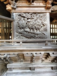 由来板を始め境内にある全ての建物の立て札が黄色一色で統一され気分が上々となりました。本殿覆い屋は格子に金網が張られておりますが1826年造営された本殿を十二分に鑑賞できます。竹田四郎治よる壮麗な彫刻を見る事が出来ました。向拝柱の龍、胴羽目3枚には源頼光の酒吞童子退治が描かれておりました。山伏姿で道を尋ねる場面、八幡大菩薩から神変奇特酒(神便鬼毒酒)を与えられる場面、毒酒を振る舞い酒呑童子と酒を酌み交わす場面で物語に夢中になる作品だと感じました。境内が整理整頓されスッキリ爽快な神社です。 (訪問:2023/01/22)