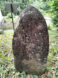 神社の脇にあります。1694年建立の高さ78cm、幅40.5cm、厚さ14cmの一字一石塔(日光市文化財)で自然石を使用しております。小石に一字ずつ経文を書写して地に埋め石塔を建立したものが一字一石塔と言われております。文字がハッキリと読め風化が感じられない石塔です。また太陽の光りが字に反射して青光りしているように見え石塔の場所を知らせているように感じました。先祖などの冥福を祈った一字一石が石塔下にかなりの数が埋まっていることでしょう。 (訪問:2023/05/28)