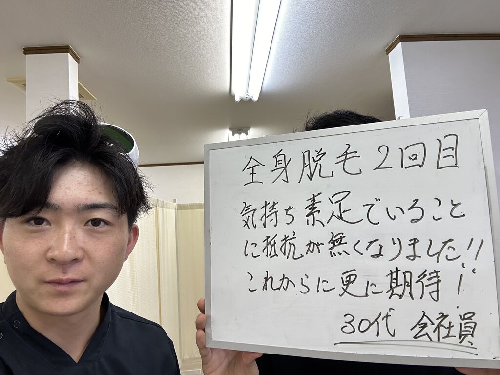体毛、特に頑固な髭には困っていました。半信半疑でお試しを数回やって見ましたがお試し期間で髭が伸びる速度、顔を洗う時抜けていく髭に正直ビックリ!!なのでプランで全身やる事に決めました。先生は若いですが、とても丁寧に丁寧にやって頂けるので雑さがないのが良いですプランも最終段階に突入しましたが、当初の自分の体毛、髭の濃さとは別人です。朝の髭剃り時間がいらないのがほんとやってよかったと思います!☆身体も要らない毛がなくなってく様をみて色々と自信が持てるようになりました。是非、悩んでる方はお試しでもやった方がいいと思います。 (訪問:2025/04/27)