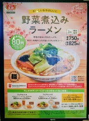 NEWトライアルの買い物帰りに訪問。注文は3月期間限定「野菜煮込みラーメン」と餃子です。野菜煮込みラーメンは野菜と豚肉がたくさん入っておりボリュームだっぷりです。チョイ辛のスープと相まってとっても美味しかったです。ぎょうざも定番の美味しさです。アプリクーポンで餃子無料券、200円引き券を使用したのでお得なランチとなりました。 (訪問:2026/03/28)