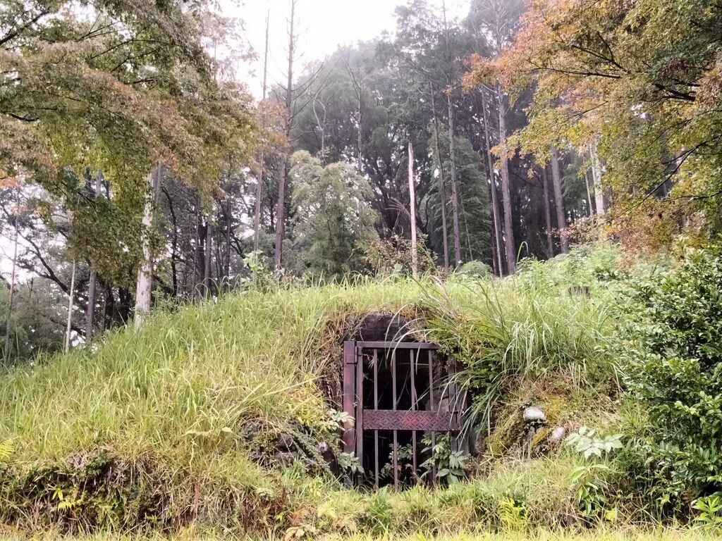 古墳を見せて頂きたく前日にお電話して本日伺いました。立野古墳(矢板市文化財)は中川を臨む丘陵斜面に築かれた推定径12.5m小円墳でUFOのような形状をしております。発掘調査で古墳時代終末期のものであると確認され石室から直刀、刀子、刀装具、ガラス小玉など多数の副葬品が出土し現在は埋め戻され墳丘を復元しているそうです。横穴式石室が開口し側壁は河原石がガッシリと組まれておりました。奥壁の巨石はコノ地を治めた大王の権力の象徴が感じられました。住職が様子を見に来られたのでお話を伺うと墓地を拡張するのに上がり偶然発見したそうで古墳までの道も整備したとのことです。両脇に住職が植えられたモミジが色づき始め古墳にスポットライトを当てているようでした。高台からお寺を含めた周辺を静かに何時までも見守ってくれている古墳です。 (訪問:2023/10/15)