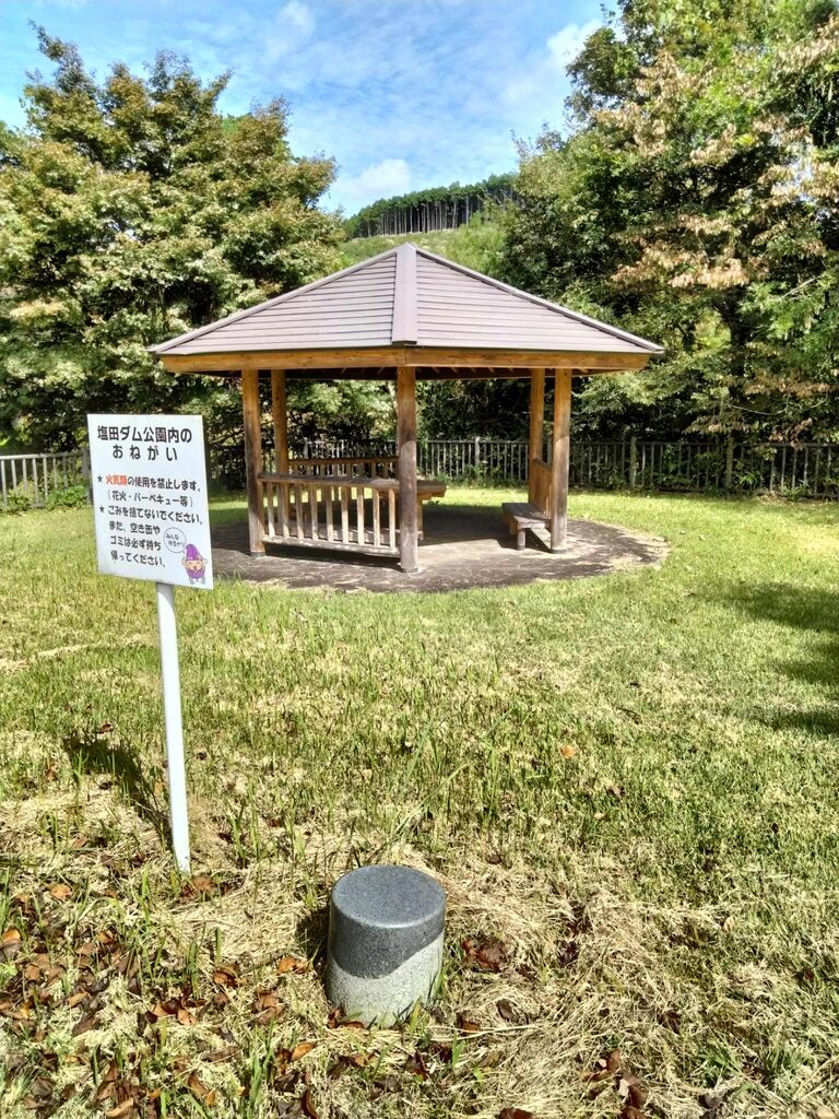 塩田ダム公園が2か所あり近い方の公園の駐車場に車を止めてダム管理事務所へと向かいました。木陰の中を横目でダム湖を見ながらの散歩といったところです。到着すると事務所前には広場になっていて東屋があり休憩しながらダム湖を眺められます。堤高26.1m、堤頂長218mのロックフィルダムで広場からは自然越流式の洪水吐と下流側に減勢工が見えました。歩行者通路からは突き出している取水塔を含めたダム湖が一望できます。雲が湖面に映り込み水が輝いて見えました。 (訪問:2023/10/08)