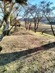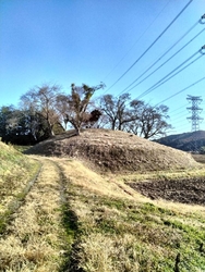 5世紀末から6世紀前半代に築造された帆立貝式前方後円墳(大田原市文化財)で全長約40.0m、前方部幅約10.5m、前方部高さ1.3m、後円部径約27.0m、後円部高さ3.5mあります。草が刈られ整備されていることもあり全体像が掴める古墳です。前方部と後円部の間のクビレ部もハッキリと確認できました。後円部の墳頂には石祠が祀られております。そこからは見渡す限りの田園風景が眺められました。 (訪問:2023/12/09)