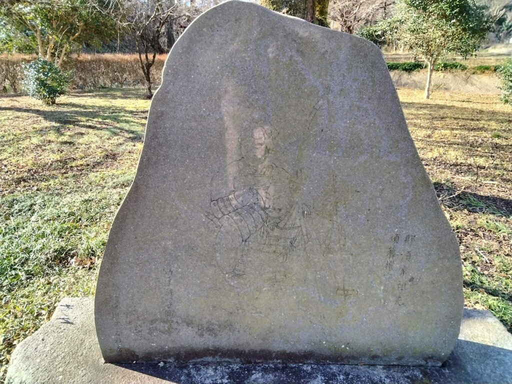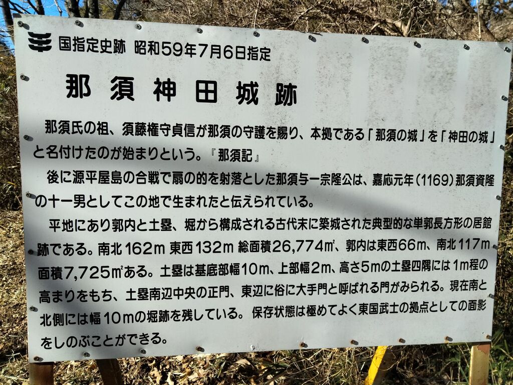 現在は那須神田城趾公園として整備されている国指定史跡の城跡で那須氏の代々の居館となり那須与一もこの那須神田城で生まれたと伝えられております。周囲は竹藪などで囲まれていて分からずに何度も通り過ぎてしまいました。駐車場の側には築城した那須氏の祖である須藤貞信の絵が石碑に刻まれております。鳥居から城跡へと足を進めました。北と南に幅10mの水堀が残り上に上がると幅10m高さ5mの土塁が南北117m、東西66mの居館跡を囲んでおりました。保存状態が良く一目で視界に入るのも良いです。土塁上には神田穂喜与稲荷神社が祀られております。須藤貞信が神田明神に戦勝祈願を行い見事念願成就した事から神田城の鬼門鎮守として分霊を勧請したのが始まりと伝えられております。説明板を読みながら城跡を眺め当時の様子が目に浮かびました。 (訪問:2024/01/27)