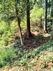 後三年の役で源義家に従って軍功を挙げた山本上総介家隆が1089年に築いた城(那須塩原市文化財)です。1533年28代山本伊勢守資宗のとき大田原城主大田原備前守資清に攻略され落城しました。県道沿いに案内板が設置されております。城跡は整備されていて三の丸跡から登城しました。杉林で草が繁茂していて踏みこめませんでしたが二の丸跡との間に土塁が築かれております。虎口から二の丸跡へと向かうとコチラも草が繁茂して踏み込めませんでしたが三の丸跡より広い敷地であることが実感できました。本丸跡へは堀切と虎口を通り辿り着くとグルリと土塁で囲まれていて二の丸跡より更にユッタリとしております。本丸跡には二條稲荷神社と宇津野神社が祀られておりました。本丸跡の脇を眺めると深い自然の堀が城の側面を守っております。天然の要害だと感じられる城跡です。 (訪問:2024/04/28)