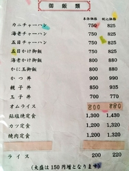 お昼時に訪問しました。麺類ご飯類、一品料理など中華料理がたくさんあります。悩んだ挙げ句に中華丼を注文です。大盛ではありませんが、なかなかのボリュームで食べ応え充分です。豚肉、うずらの卵にたくさんの野菜がアツアツの餡によく絡んでいます。一緒に付いて来るスープもおいしかったです。気になったチャーハン、ラーメン、餃子セットを次回注文してみたいです。 (訪問:2014/12)